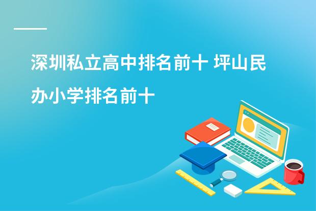 坪山民办小学排名前十的学校有:深圳市百合外国语学校、深圳中英公学、深圳外国语学校东海附属小学、深圳明珠中英文小学、坪山新区龙山学校、光明新区公明中英文学校、深圳实验承翰学校、深圳市富源学校、深圳瑞得福国际学校、深圳城市绿洲学校。