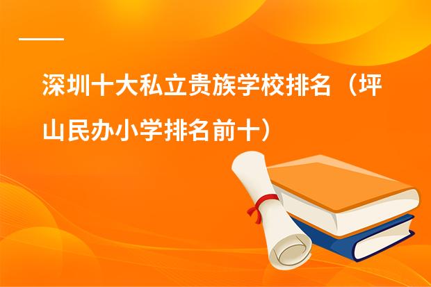 坪山民办小学排名前十的学校有:深圳市百合外国语学校、深圳中英公学、深圳外国语学校东海附属小学、深圳明珠中英文小学、坪山新区龙山学校、光明新区公明中英文学校、深圳实验承翰学校、深圳市富源学校、深圳瑞得福国际学校、深圳城市绿洲学校。