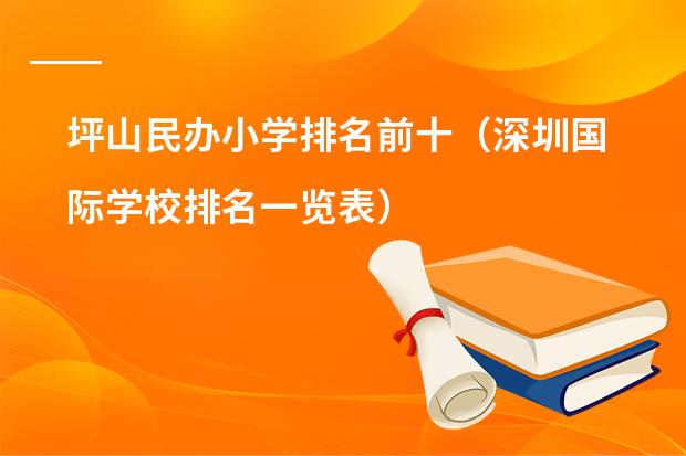 坪山民办小学排名前十的学校有:深圳市百合外国语学校、深圳中英公学、深圳外国语学校东海附属小学、深圳明珠中英文小学、坪山新区龙山学校、光明新区公明中英文学校、深圳实验承翰学校、深圳市富源学校、深圳瑞得福国际学校、深圳城市绿洲学校。